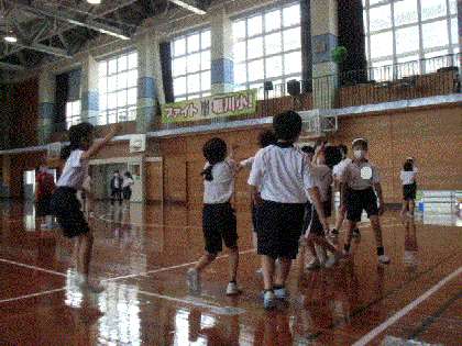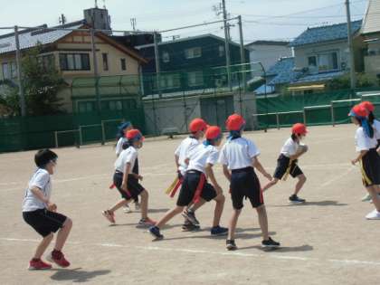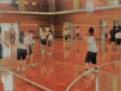 今は、1組「ビーチバレー」、2組「三角ベースボール」、3組「タグラグビー」を行っています。それぞれの種目を順に行う予定です。