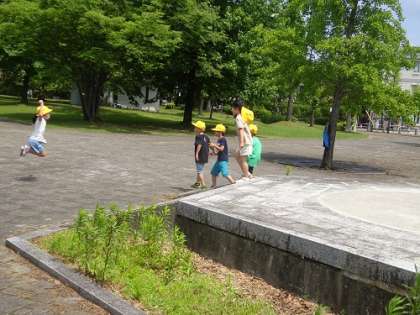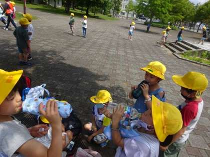 ファミリー活動の様子です。どのファミリーもなかよく活動しています。水分補給も自分たちで行っていました。