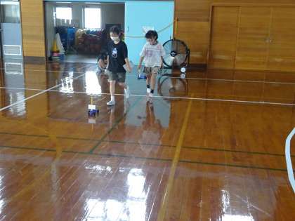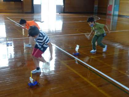今日は、うちわであおいだり、大きな送風機を使ったりして車を動かしました。