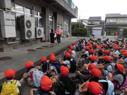 出発式では、代表のYさんが校長先生に校外学習の目当てを伝えました。その後、校長先生からお話をしていただきました。