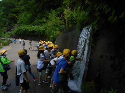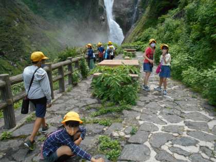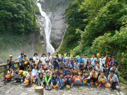 称名滝周辺を散策しました。とても涼しく、あまり見ることができない滝の姿を見たことどもたちはとても驚いていました。カメラマンに集合写真を撮影していただいている子どもたちでした。