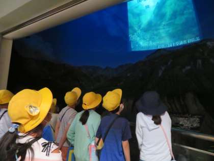 立山カルデラ砂防博物館では、常願寺川の治水の歴史や砂防の取組などについて学びました。子どもたちは、資料映像や展示を見て、「暴れ川」と呼ばれていた常願寺川の水害の怖さや、現在のくらしができるありがたさを感じたようです。