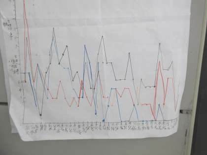 馬場級では、算数科「折れ線グラフ」の学習に取り組んでいます。自分の記録や仲間のくらし、コロナの感染者数の推移等、子どもたちがそれぞれの目的をもってグラフを作り続けてきました。データが集まってくるとグラフの見え方も変わってきたようで、子ども同士で語り合っている姿も見られます。