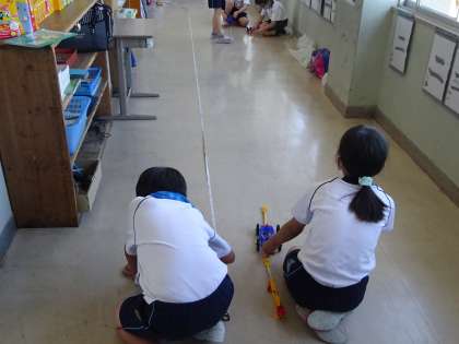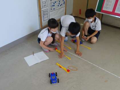 ゴムの力で進んだよ(3年生) 公開日 2021/07/01 更新日 2021/07/01 3年生 理科「風やゴムの力で動かそう」の学習で、子どもたちはゴムを使って車を動かしています。 同じ輪ゴムでもゴムの伸ばし方によって車の動き方が変わることを実験を通して理解している子どもたちです。