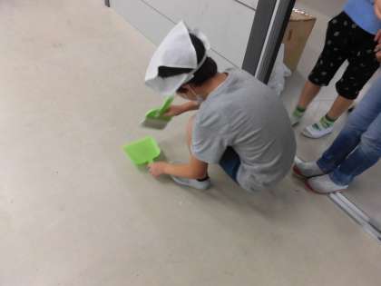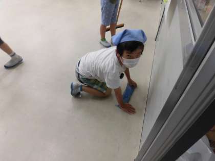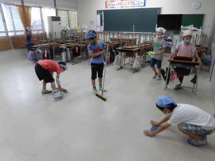 様子を見に行ってみると、自分たちの教室より大きい4年生の机を一生懸命運び、教室をほうきで掃いたり、雑巾で拭いたりしていました。周りの環境に自ら働きかける、立派な子どもたちです。