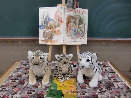 下校前、上野動物園での実話をもとに描かれた「ヒョウのハチ」と大型絵本「かわいそうなぞう」の読み聞かせを聞きました。戦争の犠牲となった動物たちの物語です。子供たちが抵抗なく聞けるように環境設定をして読みました。みんな、真剣なまなざしでお話を聞いていました。
