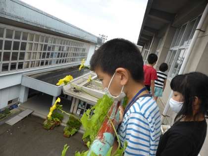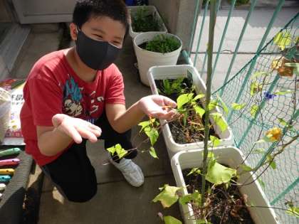 なかよしむらのベランダで、1学期から育てている花や野菜、イネがぐんぐん生長しています。4年生が種をまき、観察を続けてきたヘチマとSさんのお家からいただいた「珍しいアサガオ」は、3階のベランダまで伸びて花を咲かせています。今日、明日、明後日と、5年Kさんの立てた計画のもと、ベランダの作業の予定がびっしりと入りました。