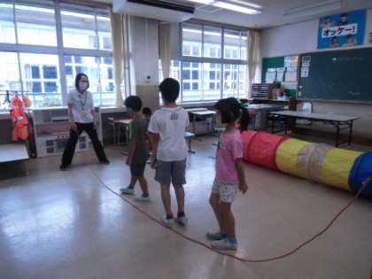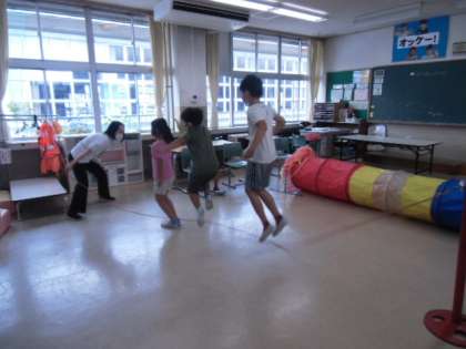 縄跳びに挑戦(なかよし級) 公開日 2021/08/31 更新日 2021/08/31 特別支援 なかよし2組では1限目に大縄をしました。みんなで何回跳べるか息を合わせて跳びました。回数が増えると「おー!」と言って喜んでいました。