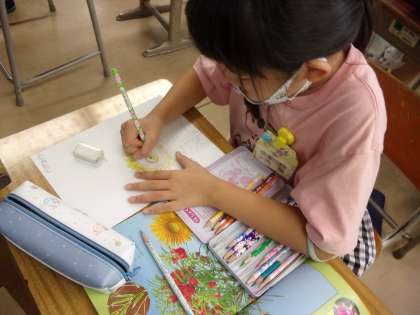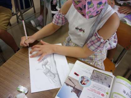 今日の図工は、理科の教科書に載っている写真をよく見て画用紙に描きました。みんな生き物の姿をよく捉えています。