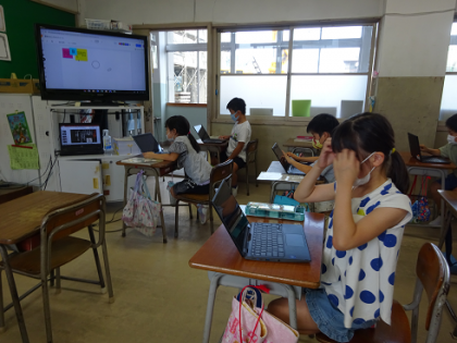 クロムブックのジャムボードを使って、一人一研究のまとめを作りました。自分の作品を写真で撮って、画像を挿入してページを作ります。付箋機能を使って思ったことや気付いたことをまとめたり、ペンで絵を描いたりして、素敵なまとめに仕上がりました。