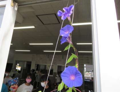5年生教室で育てている植物のプランターから、アサガオのつるが伸びていたのですが、なんと、そこに花が咲いていたのです。昨日まで誰も花が咲くとは思っていませんでしたが、今朝になって大きく花が咲いていたのです。