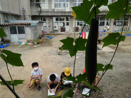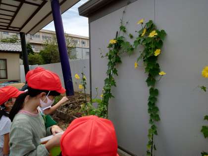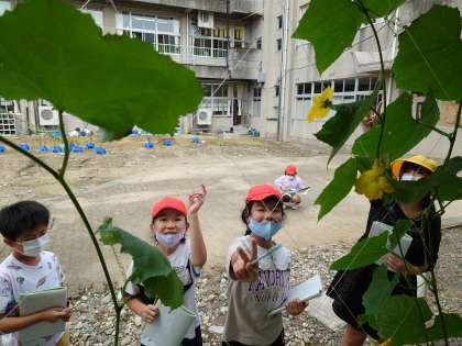 ヘチマの観察をしました(4年生) 公開日 2021/09/07 更新日 2021/09/07 4年生 理科の学習では、1学期から大切に育てているヘチマを観察しました。 少し見ない間に、大きく成長しているヘチマを見て驚いている子どもたちです。 「先生、大きいお花咲いてて、よく見たら真ん中にヘチマの赤ちゃんできてた!」 「一番大きいヘチマは30cmくらい。食べられるかな。」 様々な思いを持ちながら観察していました。 どこまで成長するか、楽しみですね。