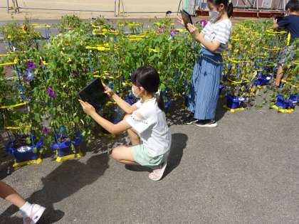 いろいろな花を観察したよ(3年生) 公開日 2021/09/08 更新日 2021/09/08 3年生 理科の学習で、今、堀川小学校の身の回りに咲いている花を観察しました。 堀川小学校には、アサガオ、ヘチマ、サツマイモ、ホウセンカなどたくさんの花が咲いていました。 それぞれの花の特徴を確認しながら、詳しく観察したり写真を撮ったりしました。
