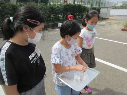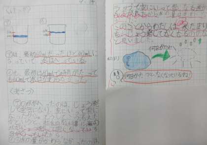 理科「自然のなかの水のすがた」の学習では、水の量がどのように変わるかを実験しています。2つのビーカーを用意し、水の減り具合を観察しました。4年生も後半になって、観察した結果をノートにまとめるのもうまくなってきました。