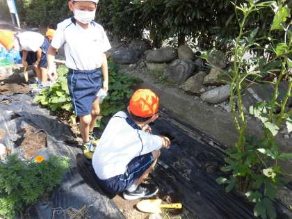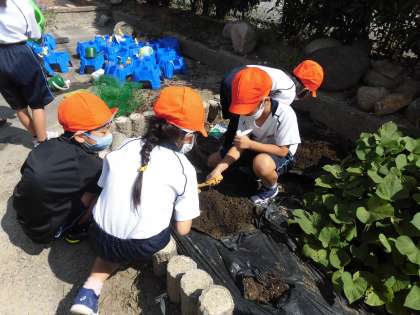 9月15日、2年4組では生活科の学習で秋野菜の種を植えました。1学期はほとんどの子どもたちが苗から野菜を育て、収穫を喜んだり、途中で枯れてしまったことに悲しんだりするする姿が見られました。今度は種から野菜を育てることに挑戦です。無事収穫することができるのでしょうか。楽しみです。