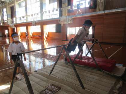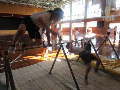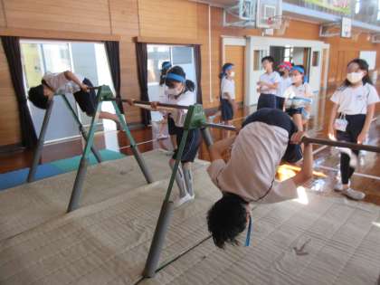 体育館に鉄棒が設置されました。今日の体育の時間には、リレーの練習をした後に、少し練習する時間を設けて取り組みました。久しぶりの鉄棒を見て、どの子もうれしそうでした。