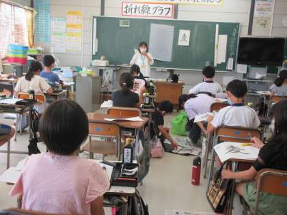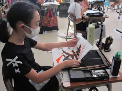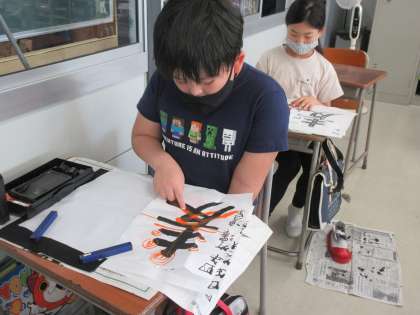 書写の時間の様子です。前回の作品をよく見て、目当てを立てたり、注意点を真剣に聞いたりしています。