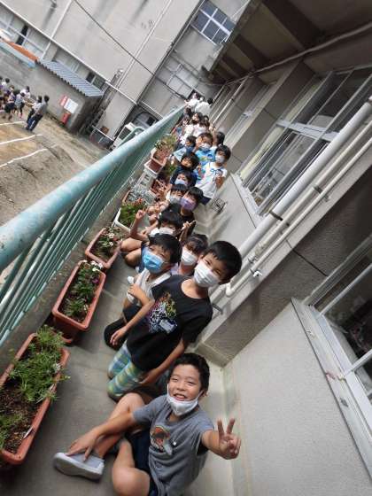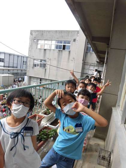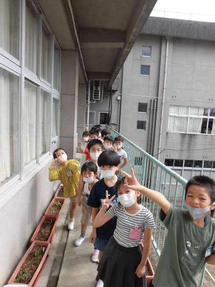 9月28日に、全校集合写真を撮りました。4組はベランダから写してもらいます。撮影まで少し待ち時間がありましたが、安全のため手すりには触らず、落ち着いて撮影の時を待ちました。仕上がりが楽しみですね!