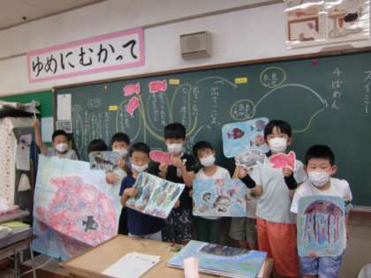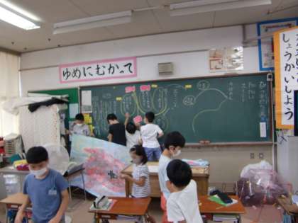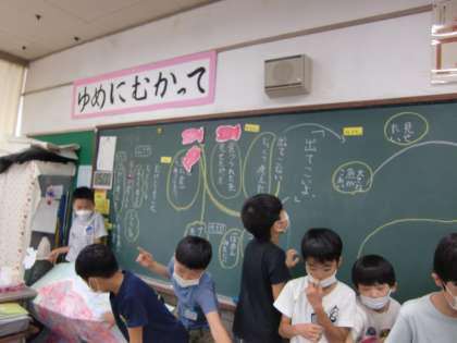 国語科の学習から (2年生) 公開日 2021/09/28 更新日 2021/09/28 2年生 4場面の「スイミーが海の中で仲間たちと楽しくくらしていくために知恵をしぼる」場面の話し合いをしました。「赤い魚たちに海の中のめずらしいものやおもしろいものをどうしても見てたかったから、うんと考えたスイミー」「みんなで協力することをじっくりと考えたスイミー」等、スイミーになったつもりで気持ちを考えて仲間に伝えました。 今日の学習後の片付けも仲間と楽しく丁寧に取り組む皆さんでした。