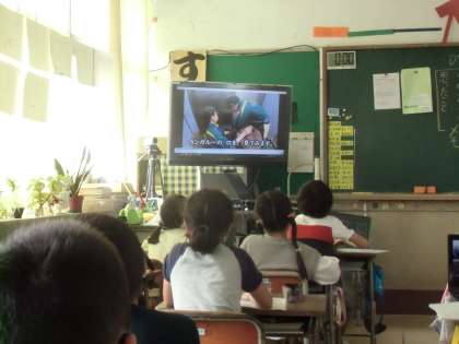 2組での国語科「どうぶつ園のじゅうい」の学習では、文章を書いているうえだみや先生に質問したいことがある子どもたちが、うえだみや先生の働いている動物園を調べました。動物園とコンタクトを取ると、うえだみや先生の働く様子のDVDを送ってもらえ、今日観てみました。