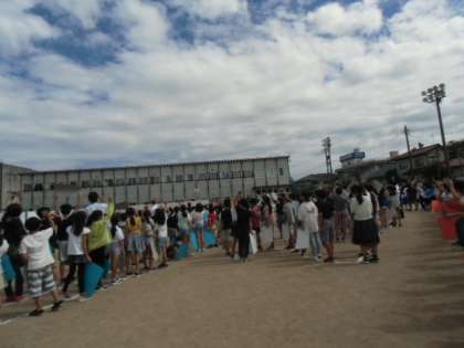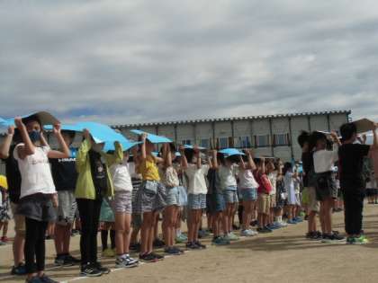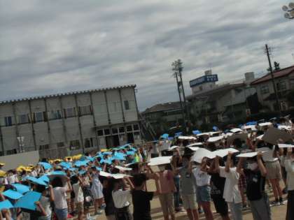 3限目に航空写真を撮りました。飛行機が飛んで来たときに「わー、飛行機だー。」と嬉しそうな子どもたちでした。色画用紙を数分の間頭の上で持ちました。「腕が痛い。」という仲間に対して「痛いね。でも、頑張ろう。あと少しだよ。」と励ます子どももいました。最後は飛行機に向かってみんなで手を振りました。どのような人文字写真になったのか楽しみですね。