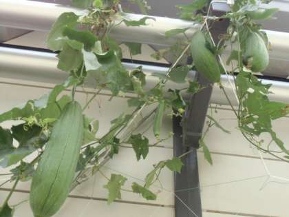 ヘチマの実がたくさんできました。少し前まで黄色の花がきれいにたくさん咲いていたので、実になり始めているものやどんどん大きく成長しているものなど様々なサイズのヘチマの実がなっています。一番大きいもので長さが約45センチになっていました。どこまで大きく成長するのか楽しみですね。