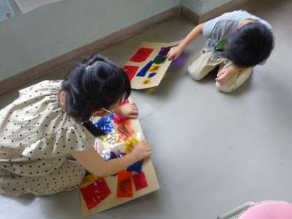 カッターナイフを使って、段ボールを好きな形に切って、7色のセロファンを貼りました。作った作品をお日様の光に当てると、影にも色が付くことを知って、自分の作品を様々な角度に動かしながら、光の美しさを楽しみました。