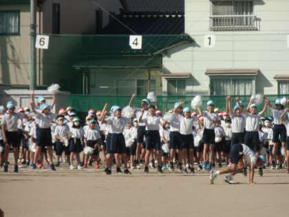 白団はくじ引きにより一番最初に応援タイムが始まりました。白団全員が白色のポンポンを持ち応援しました。聖火塔も登場するなど工夫されていました。