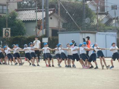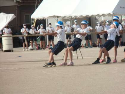 1限目に団体競技の綱引きをしました。団の仲間と力を合わせて懸命に綱を引っ張っていました。くいしばる表情がかっこよかったです。