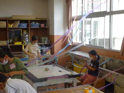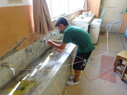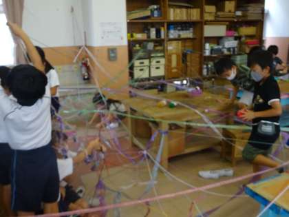 タフロンテープや紙テープ、毛糸を図工室のいろいろな場所に結びつけて、ひもがつくる形や色の感じを楽しみました。