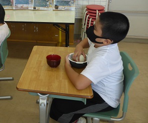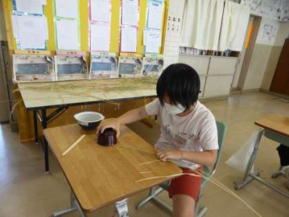 まず、稲穂に付いている籾を、1本ずつ丁寧に「お腕」を使って取り離しました。割り箸を使って取る方法もあり、5年生は、両方のやり方を器用にマスターしていました。