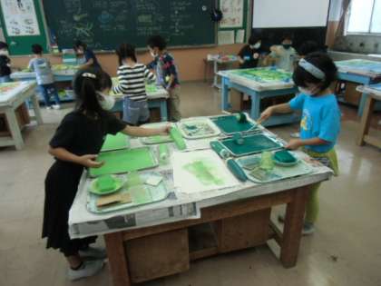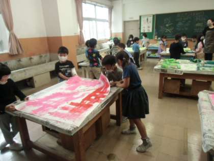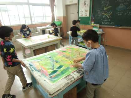 ローラーで大きな紙に色を塗りました。「赤色は端っこだけに塗ろう。」「海のような感じにしよう。」などとファミリーで話し合いながら進めていました。みんなが笑顔でとても楽しそうに色を塗っていました。