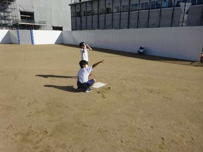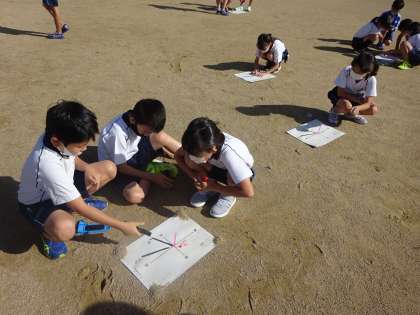 太陽の動きとかげを調べたよ(3年生) 公開日 2021/10/14 更新日 2021/10/14 3年生 理科の学習で、一日の太陽の動きとかげの長さを調べました。 朝から1時間ごとに太陽の動きを観察し、記録していきました。 一日の間に太陽が動いていることや、かげの長さが変化することに気付いた子どもたちです。