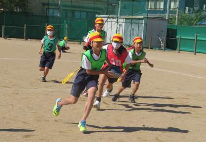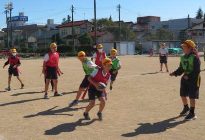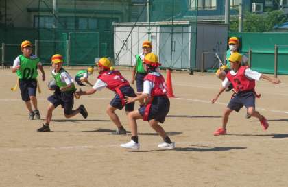 タグラグビー(5年生) 公開日 2021/10/22 更新日 2021/10/22 5年生 5年1組では、体育で「タグラグビー」の学習に取り組んできました。今日は、リーグ戦の最終日。どのチームも作戦を工夫し、声をかけ合いながら、白熱した試合をしていました。