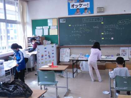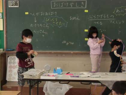おたのしみかい(なかよし級) 公開日 2021/10/28 更新日 2021/10/28 特別支援 おたのしみかいの「おばけやしき」をしました。教室を「おばけやしき」にして楽しもうと紙皿や画用紙等を使って変顔おばけやUFOを作りました。