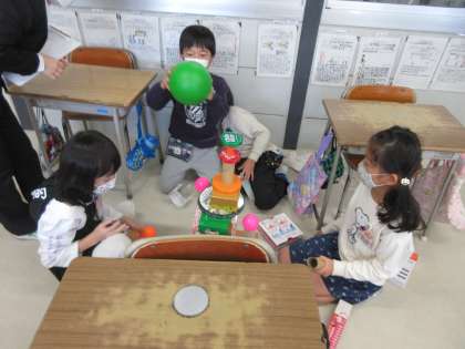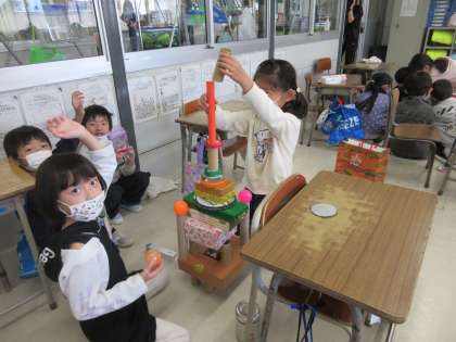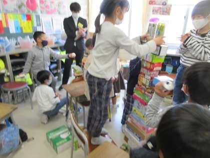 算数科「みのまわりのかたちであそぼう」の学習が始まりました。空き箱や空き缶を使って、タワーを作ったり、箱を積み上げたりする中で、「丸いと安定しないな」「大きいものを下にした方がバランスがとりやすいよ」など、形の特徴や機能に目を向け始めている子どもたちの姿が見られました。空き箱や空き缶の準備をありがとうございました。