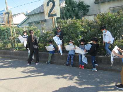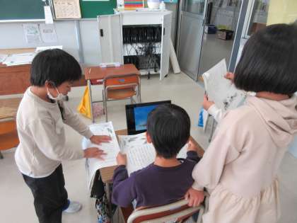 国語科「こえにだして よもう—くじらぐも—」の学習を進めています。今日は、天気が良かったため、外に出て「くじらぐも」を音読しました。雲を見ながら、「くじらぐもは、あのくらい大きいと思うから、『おおきな くじら』は、大きな声で読みたいな」など、読み方を工夫する子どもたちの姿がみられました。