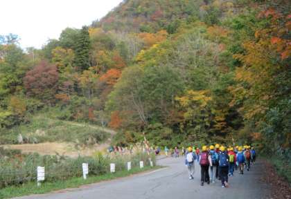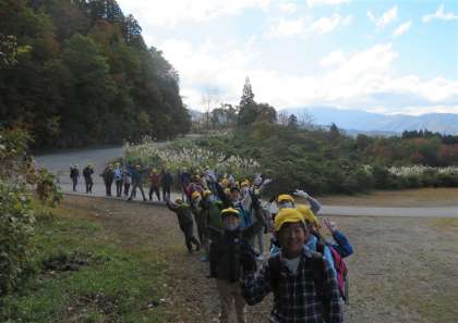 国立立山青少年自然の家を出発し、いよいよ来拝山登山口へ! 子どもたちの足取りは、まだ軽やかです。