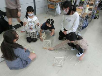 図画工作科「つなぐんぐん」の学習を行っています。割りばしを輪ゴムでつないで様々な形を作っている子どもたちでした。お互いの作品を見せ合って楽しんでいる様子も見られました。