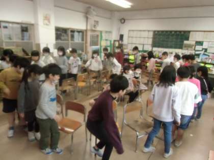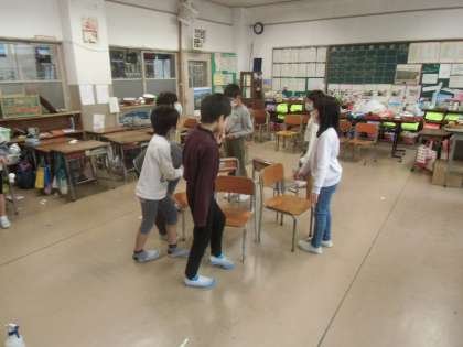 学活の時間にゲーム係の4ファミリーが企画した「いすとりゲーム」を行いました。進行やルール説明を分かりやすく行っていました。たくさん練習した成果が出ていました。