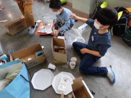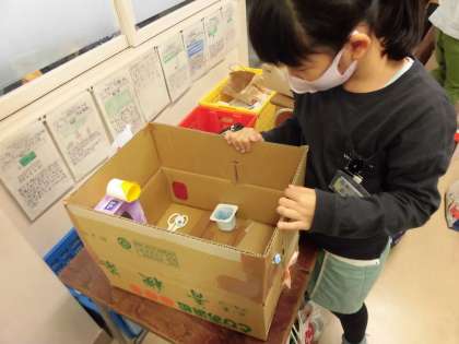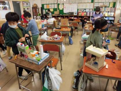 4組では、図画工作科の学習「こびとに おうちを プレゼント」に取り組んでいます。こびとが住みやすいように、家の中にエレベーターを付けたり、お風呂を作ったり、毛糸で作った枕や布団を設置したりしています。
