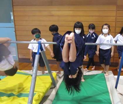 1年2組では、体育科「てつぼうあそび」の活動を続けています。目当ての技を決めて練習に取り組む子ども、自分でオリジナルの技を考え出そうとする子ども、鉄棒を使った遊びを創作して仲間と競争をする子どもなど、それぞれが楽しんでいる「てつぼうあそび」は多様です。そんな中、「〇〇さんの考えた『たまご』というオリジナル技、とても楽しいよ!」「今日〇〇さん初めてこうもりができるようになったんだよ!」といった仲間の取組を温かく認めようとする子どもたちの言葉がいつも以上にたくさん聞かれた今日の活動でした。