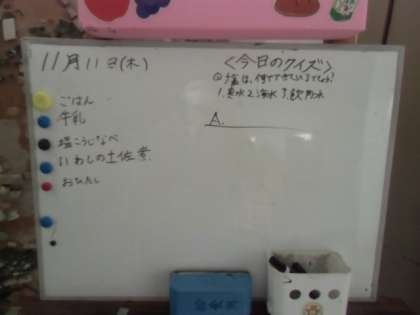 今日の給食 公開日 2021/11/11 更新日 2021/11/11 給食室 塩こうじは、こうじに塩と水を加えて、10日ほど常温で発酵をさせたものです。お米の甘みと塩の辛みが合わさり、いろんな料理につかえる調味料です。家でもかんたんに作ることができます。