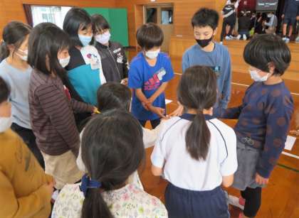 交流集会(5年生) 公開日 2021/11/13 更新日 2021/11/13 5年生 集会委員会が企画した「絆を深めようウィーク」。今日は5年生と2年生の交流集会でした。色団に分かれ、ファミリーごとにじゃんけんゲームをして楽しみました。集会後も5年生の近くに集まり、じゃんけんをしたがる2年生の姿に、5年生もうれしそうでした。また、集会委員の子どもたちは、後片付けまでしっかり行っていました。