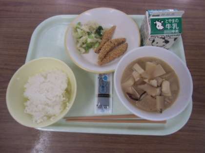 今日の給食 公開日 2021/11/19 更新日 2021/11/19 給食室 収穫された富山県内の里芋が出回っています。里芋は、親芋の周りに小いも、孫いもがつくことから、子孫はんえいの縁起をかついで、正月料理などに使われます。
