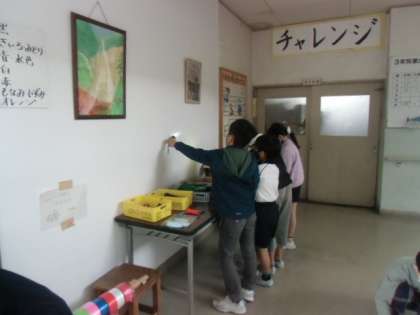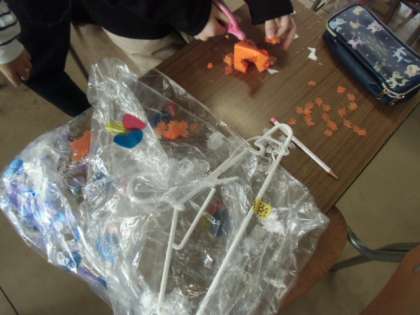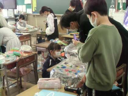 透明のナイロン袋に様々な材料を組み合わせながら絵を描いています。「イチョウの木を表すために重ねながらセロハンを貼っているよ。」「川を表すのにビニールテープを細く切ったりマジックで描いたりしているよ。」など今自分が頑張っていることや工夫をしていることを話していました。思い描く絵を作ろうと工夫しながら夢中になって作品作りに取り組んでいます。
