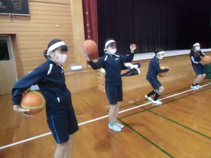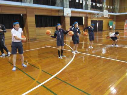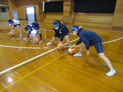 屈伸したり、足を延ばしたりながらボールを腰や床などで回すことで、ボールに慣れながら準備運動を行いました。普段のストレッチにボール回しが加わることで、まったく違ったものになり、子どもたちは必死でした。