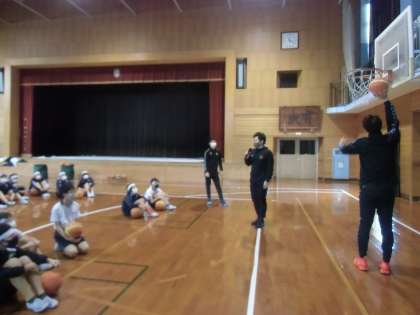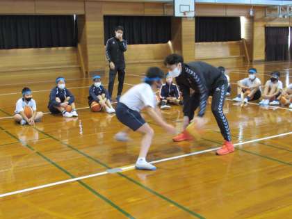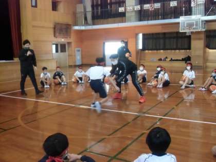 最後には、プロで活躍しておられた選手との真剣勝負!。一対一で、選手からボールをとる対決や、時間内にどれだけシュートが入れられるかの対決をしました。子どもたちは全力で挑みましたが、やはりプロの技には敵いませんでした。鍛練されたボールさばきは、圧倒的でした。