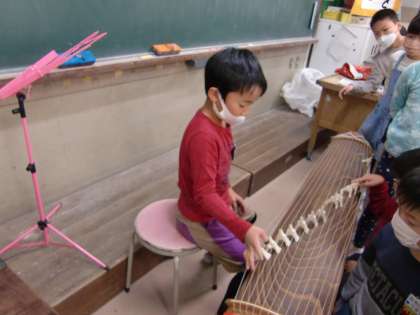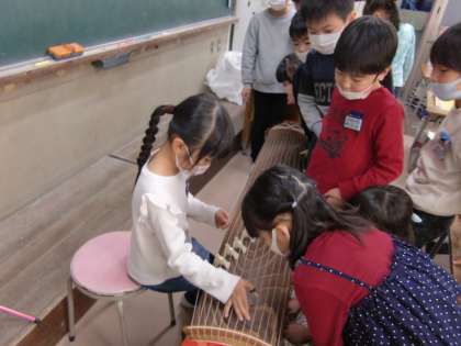 琴に触れてみて (2年生) 公開日 2021/12/04 更新日 2021/12/04 2年生 琴の伴奏でこころのうたとされている「かくれんぼ」「虫の声」「夕やけこやけ」を歌を口ずさんでみました。その後、琴の爪をつけて琴線をならしてみました。 学習の終わりの伝え合いでは、「初めて、琴に触れて最初は難しいと感じたけど、音が出せて嬉しかったです。」「楽器に触れることができて思い出になりました。」などと、和やかな言葉が伝えられました。