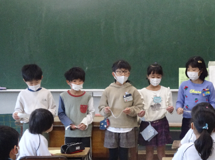 生活科の学習で進めてきた「わくわくおもちゃランド」で、1年生に自分の作ったおもちゃを紹介しようと、交流活動を計画しました。1年2組の皆さんが遊びに来てくれて、2年生は自分の作ったおもちゃの遊び方を分かりやすく伝えようと必死に話しました。